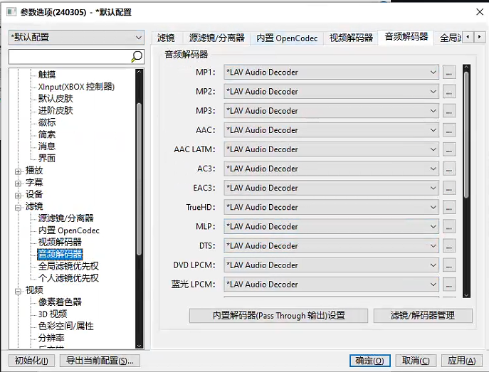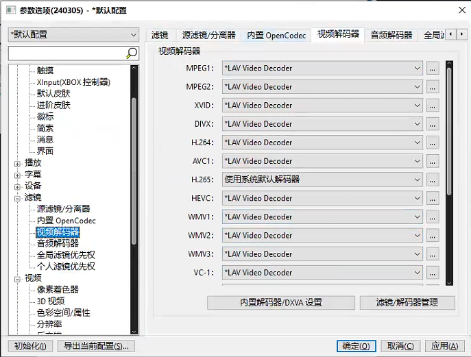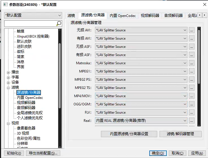 打开PotPlayer , 右键 → 选项 → 滤镜,按照如下配置设置: