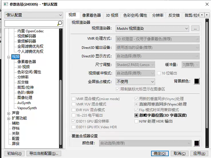 打开PotPlayer , 右键 → 选项 → 视频,按照如下配置设置:
